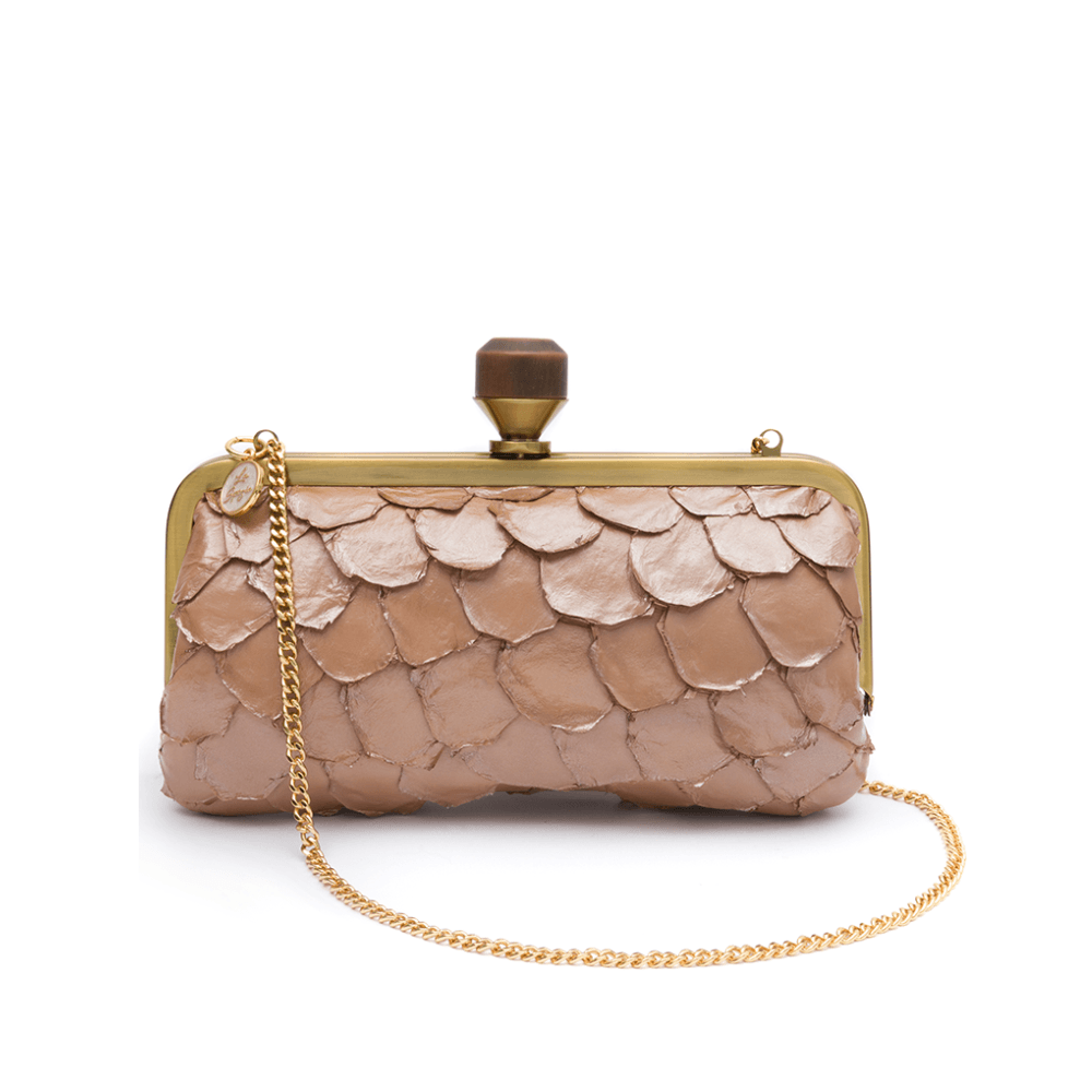 Clutch La Spezia em couro de Pirarucu com fechamento em armadura de metal adornada com pedra. Traz interior em material têxtil estampado com compartimento para pequenos objetos. Acompanha alça tiracolo em metal.