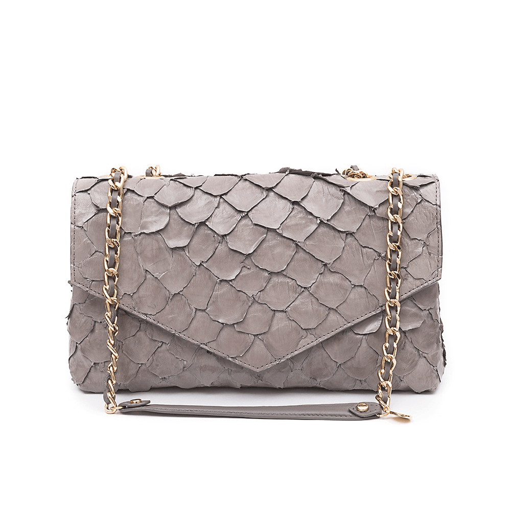 Bolsa La Spezia confeccionada em couro de peixe pirarucu. Fechamento por botão de imã e metais ônix. Possui alça de corrente que pode ser ajustada em dois tamanhos, tiracolo ou ombro. Seu interior é feito em forro com estampa exclusiva La Spezia.Seu design clássico e luxuoso é perfeito para sofisticar qualquer look.