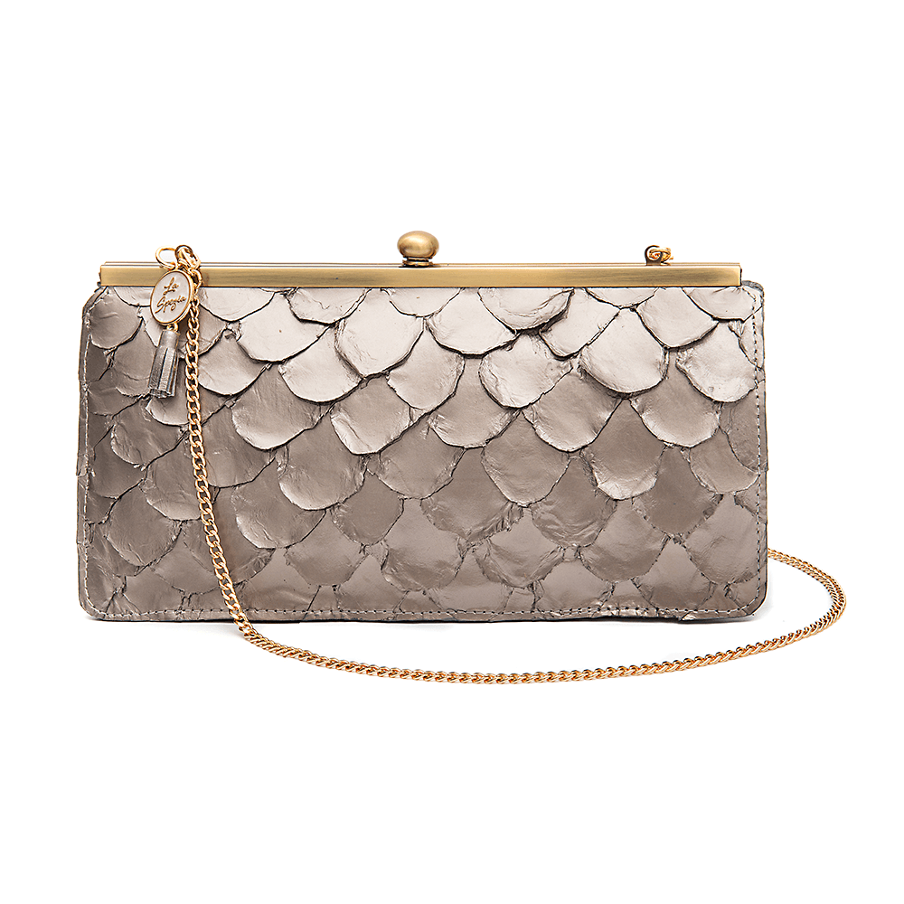 Bolsa La Spezia confeccionada em couro de peixe Pirarucu. Fechamento por armadura de metal e metais ouro. Possui alça de ombro removível em corrente, podendo assim, também ser usada como clutch. Seu interior é confeccionado em forro liso e possui espaço para pequenos objetos. Escolha perfeita para sofisticar qualquer look.