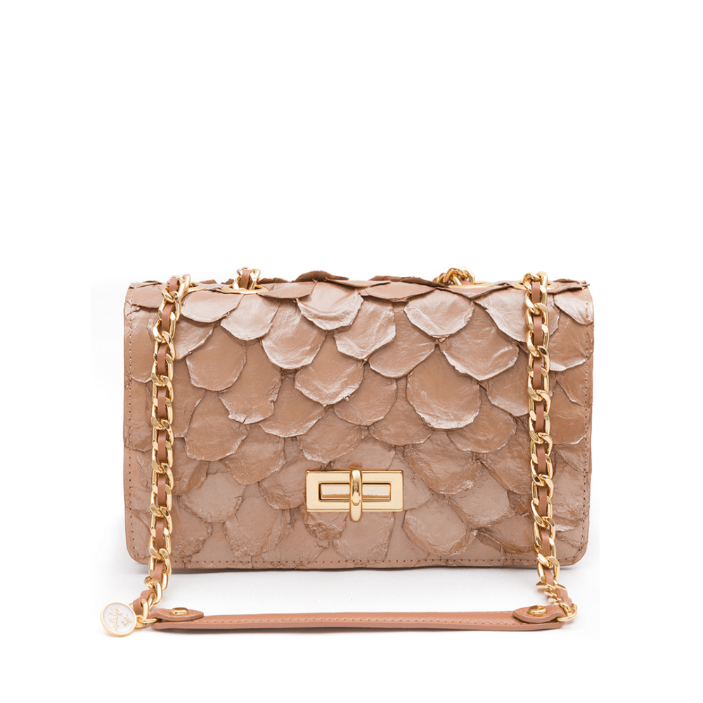 Bolsa La Spezia confeccionada em couro. Versão menor da bag Catarina. Fechamento por torniquete e metais ouro. Possui alça dupla de corrente que pode ser ajustada em dois tamanhos, tiracolo ou ombro. Seu interior é confeccionado em forro com estampa exclusiva La Spezia e possui três divisões internas, dois espaços para pequenos objetos e espelho. Seu design autentico é perfeito para sofisticar qualquer look.