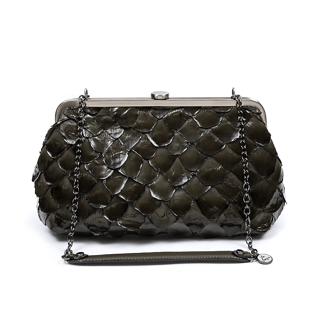 Bolsa La Spezia confeccionada em couro de peixe pirarucu. Fechamento por armação de metal com resina e metais banhados a ônix. Possui alça de corrente com ombreira em couro bovino. Seu interior é feito em forro com estampa exclusiva La Spezia. Seu design clássico e luxuoso é perfeito para sofisticar qualquer produção.