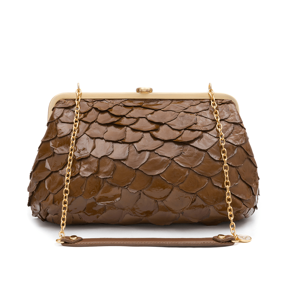 Bolsa La Spezia confeccionada em couro de peixe pirarucu. Fechamento por armação de metal com resina e metais banhados a ouro. Possui alça de corrente com ombreira em couro bovino. Seu interior é feito em forro com estampa exclusiva La Spezia. Seu design clássico e luxuoso é perfeito para sofisticar qualquer produção.