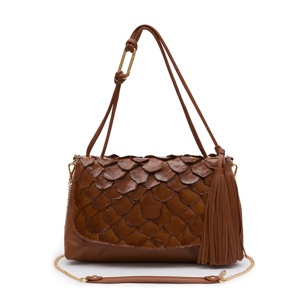 Bolsa La Spezia confeccionada em couro bovino e pirarucu, Fechamento por imã e metais. Possui alça de corrente com ombreira em couro para transpassar, e alça menor em rolote com detalhe de mosquete. Seu interior é confeccionado em forro com estampa exclusiva La Spezia e possui espaço para pequenos objetos e porta cartão. Seu design contemporâneo é perfeito para compor qualquer look com muita personalidade.