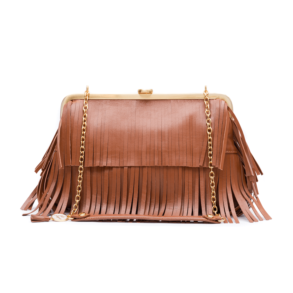 Bolsa La Spezia confeccionada em couro Bovino estilizada com franjas por todo o comprimento, Fechamento por armação de metal com resina e metais banhados a ouro.