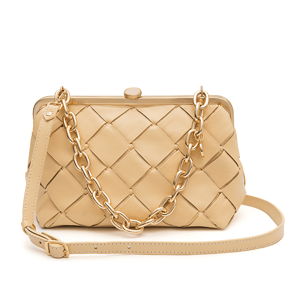 Bolsa La Spezia confeccionada em couro bovino, com detalhe trançado a mão por todo corpo da peça. Possui alça de corrente em elos, e alça tiracolo fina ajustável em couro bovino. Fechamento por armação de metal com detalhe de resina; Seu interior é confeccionado em forro com estampa exclusiva La Spezia e acompanha um porta cartão, escolha perfeita para estilizar qualquer look.