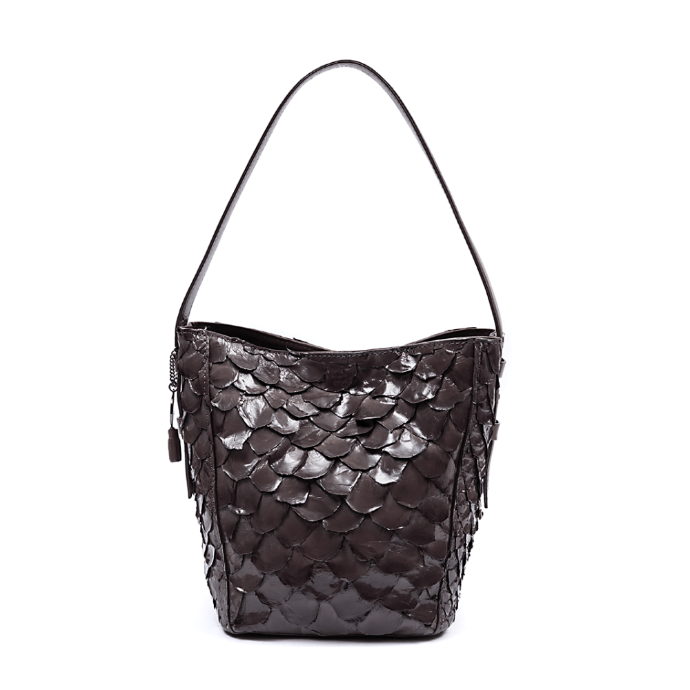 Bolsa La Spezia confeccionada em couro de pirarucu e metais, possui uma proposta de “bucket” em couro de pirarucu, com uma alça de ombro em couro bovino com regulagem e seu fechamento em botão de metal, acompanha uma nécessaire removível. Seu interior é confeccionado em forro com estampa exclusiva La Spezia, conta com dois bolsos internos e acompanha um porta cartão bovino. Seu design autentico é perfeito para sofisticar qualquer look.