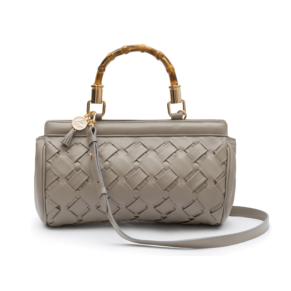 Bolsa La Spezia confeccionada com detalhe trançado a mão por todo corpo da peça. Possui uma alça de bambu, fechamento por 6 imã na pala superior e alça removível em couro bovino. Seu interior é confeccionado em forro com estampa exclusiva La Spezia e possui um bolso interno e um porta cartão. Medidas: